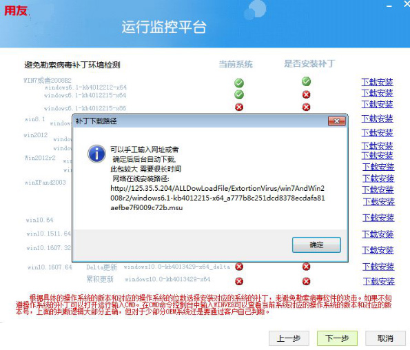 系統(tǒng)會彈出提示,告知下載耗時以及可以手工到對應(yīng)地址下載安裝,點(diǎn)擊“確定”系統(tǒng)開始下載及安裝相關(guān)補(bǔ)丁。